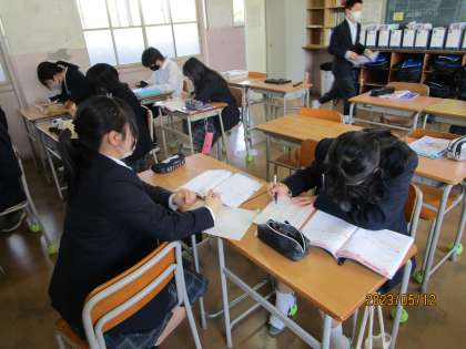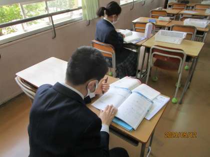 5限の単元テストに向けて昼休みに勉強している人たちです。さすが3年生ですね。