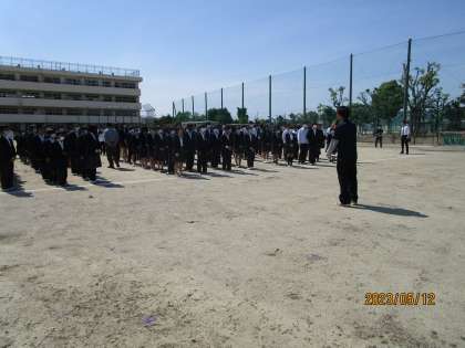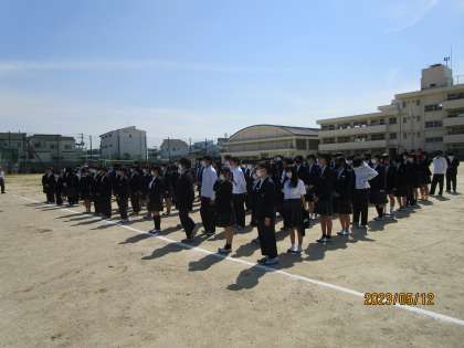 6限の避難訓練の様子です。避難するときに私語がないか、素早く非難できていたか、集合してから静かに待てたか、の三つのポイントで校長は評価しました。満点、100点です。すばらしい。本当に良かった。すごい。その後、大東市危機管理室の方に来ていただき、東日本大震災のときに、避難所で中学生や高校生が配給の弁当、幼児の遊び相手、水運び、清掃、その他いろいろと大活躍した話をお聞きしました。あってはならないことですが、万が一のときにはがんばりましょう。そして、校長から、そのときには、ふだん顔見知りになっていることがすごく大事です。あはようございます、こんにちはのあいさつを地域の方と少しでも交わすようにしようと話しました。