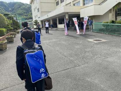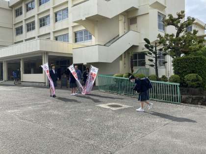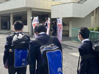 雨上がりの雲の多い空の下、登校してくる生徒たちに元気にあいさつをしている生徒会役員の人たちです。今日もカメラの不調で撮影はしたのですが、ここにアップできるのはこれだけです。すみません。