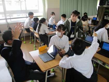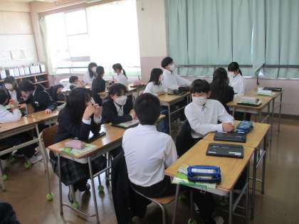 先生の質問に周りの人と意見交流をしているところです。なんでもないことですが、こういったことも使いようによって、ものすごく効果のあることとされています。