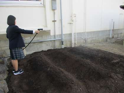 はるかのひまわり絆プロジェクトは 阪神大震災由来のひまわりの種「はるかのひまわり」を全国で生育し咲かせていただく過程で、災害や命の尊さを再考する機会とし、 自らの元気を取り戻す。」というものだそうです。(ヤフー記事より)それを受け、本校の生徒会で畑を作り、昨日ひまわりの種をまき、そこに水をやっている写真です。すばらしい。