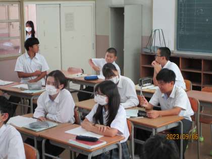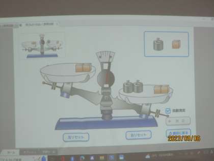 等式の性質について丁寧に勉強していました。上皿てんびんを見尾出るに=(イコール)の意味について説明を聞いていました。