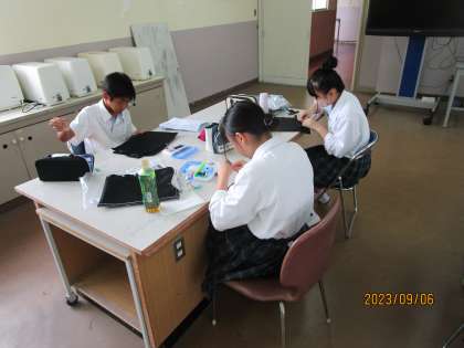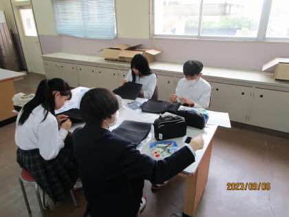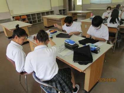 かばんを作っています。厚い布に針を通すのが大変な様子です。