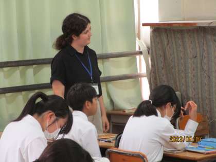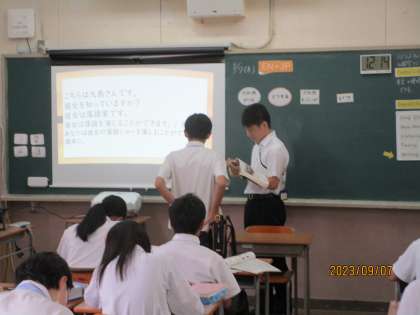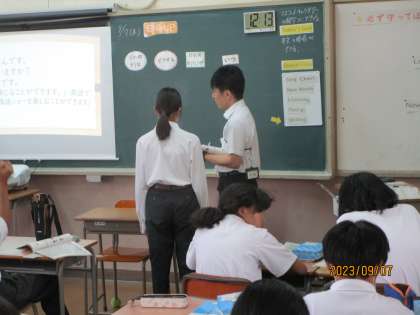 今日は授業の後半に英語の暗唱を先生に聞いてもらっていました。待つ間はペアやAETの先生を相手に練習をしていました。