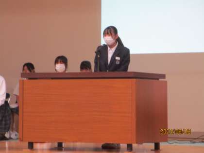 6限、体育館で行いました。始めに選挙管理委員長からのあいさつです。立派です。