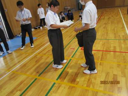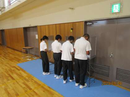 演説が終わり、大東市選挙管理委員会より借用した本物の記載机、投票箱を使って投票となりました。選管が投票用紙を一人ずつ配っています。かっこいいです。