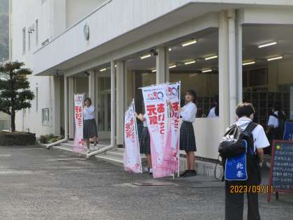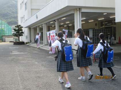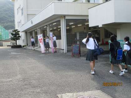 月曜日です。おはようございます。日差しが強く、下足室の陰であいさつ運動です。