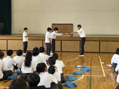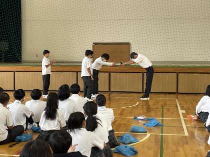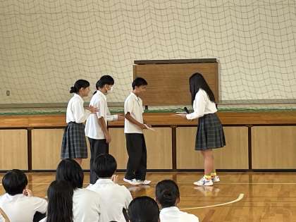 バドミントン部が大東市大会で優勝、準優勝と好成績でした。大東フューチャーコンテスト健闘賞、生徒会主催グッドアイデア賞の各表彰を行いました。みんな、すばらしい。