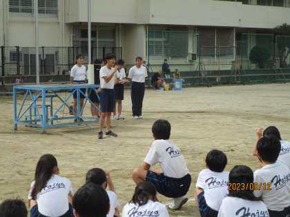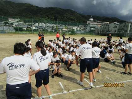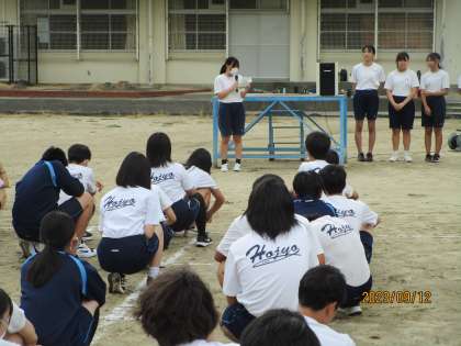 全体練習初日です。グラウンドに集合し、生徒会役員の進行で、体育委員の服装点検、体育委員長の決意表明「3年生は最後やからがんばる。1年2年は俺たちについてこい。」と力強くあいさつしました。かっこいー。そのあと、草抜き、石拾いとなったところで雷が鳴り、急遽、体育館に移動することになりました。