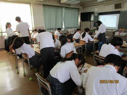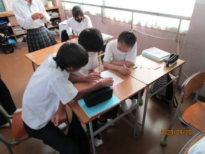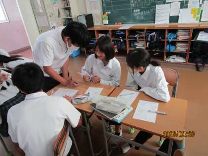 1次関数の勉強をしています。今日はグラフについて問題を解いていました。個人思考の後、学び合いが始まりました。教える方も真剣に説明している姿に感動しました。
