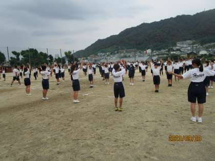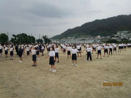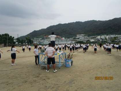 3年生の体育委員が前に立ってラジオ体操の練習でした。