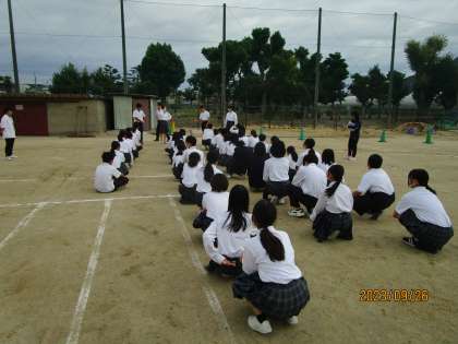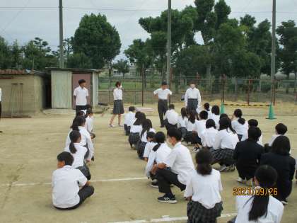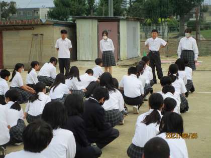 今朝は学年集会がありました。まずは1年生の学年集会の様子です。学級委員が体育祭予行でがんばっていたことなどの感想を話していました。すばらしい。