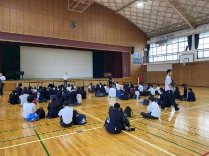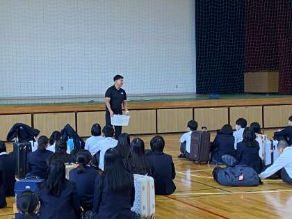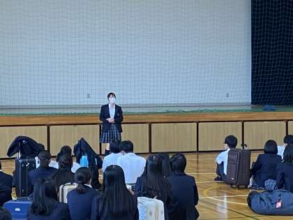 東京に向けての修学旅行です。体育館での出発式です。学級委員より、あいさつがありました。素晴らしい。