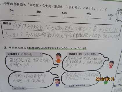 体育祭の感想用紙が掲示されていました。漫画で感想を示すコーナーもあったりして、面白いです。前向きが感想が目立ちました。