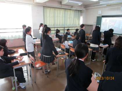 黒板にあるスクリーンにイギリスの民族衣装を着た人た楽器を演奏している姿が映ってい、ます。それを見て、先生がこの人はどこの国の人ですか、持っている楽器は日本で言えば何という楽器に似ていますかなどど質問していきます。隣同士二人一組で、どちらかの人が正解を言えば、座ることができます。