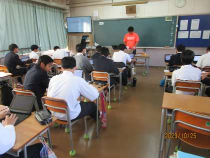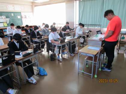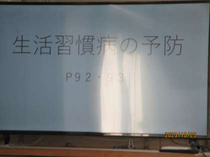 先生が「生活習慣病の話、1年でどこまで教えたか、覚えていますか。」と生徒に尋ねている場面です。生徒はいくつか答えていました。すばらしい。先生も「よく覚えていますね。」と返していました。