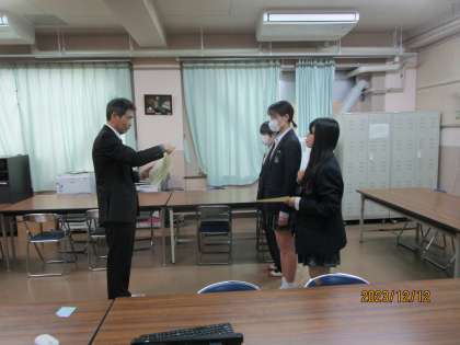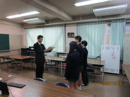 本日の生徒集荷はインフルエンザ予防のため、オンラインで行いました。会議室からタブレットを使って配信しました。写真は大東市図書館を使って調べるコンクールで優良賞をもらったので、表彰しているところです。