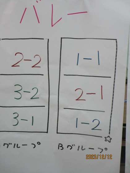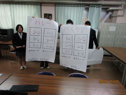 次に今度行われる球技大会の組み合わせが発表されました。全クラス参加です。バレー、バスケット、ドッチボールと分かれるそうです。