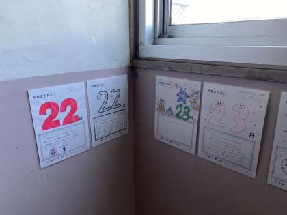 階段の踊り場に3年生の残りの登校日数が日めくりカレンダーのように掲示され始めました。