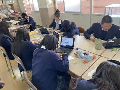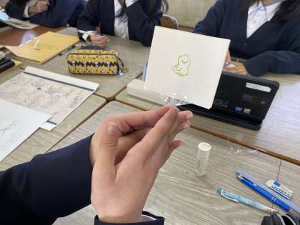 10センチほどの棒に裏表の絵を貼り、くるくる回すとパラパラ漫画になります。面白いです。3枚めの写真の作品はパラパラすると、カゴの中の鳥が飛び出すように見えます。先生が絶賛した作品です。素晴らしい。
