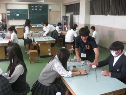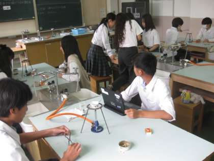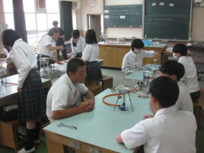 理科室で実験をしていました。ガスバーナーの火のつけ方も班で協力してできていて、さすが3年生と思いました。