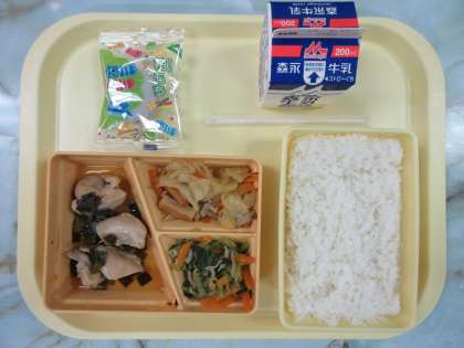 白ご飯、ごはんがすすむくん、豚肉と野菜のしょうが煮、小松菜のじゃこ炒め、柏もち、牛乳です。