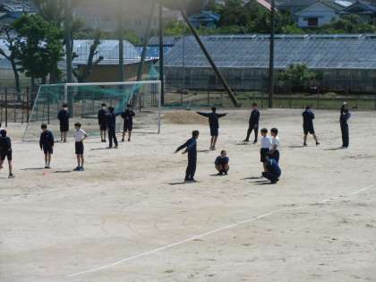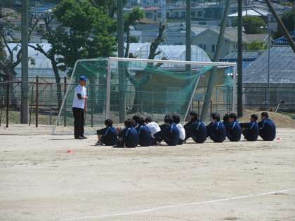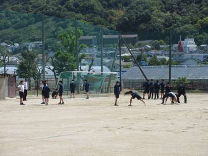 男子はグラウンドでラジオ体操の確認を行っていました。