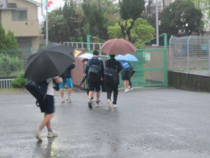 教員が見送る中、雨が降っていますが気をつけて帰りましょう。
