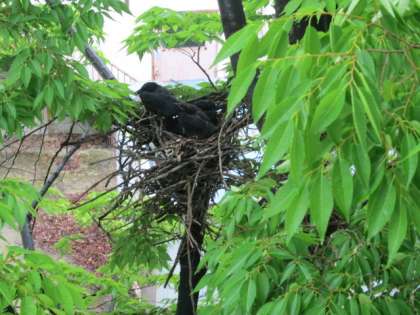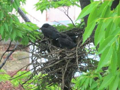 校舎に近い木の中付近にカラスが巣を作ってヒナを育てています。