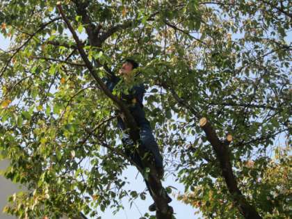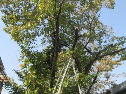 今日は本校のプール付近にある桜の木の剪定作業を行っています。