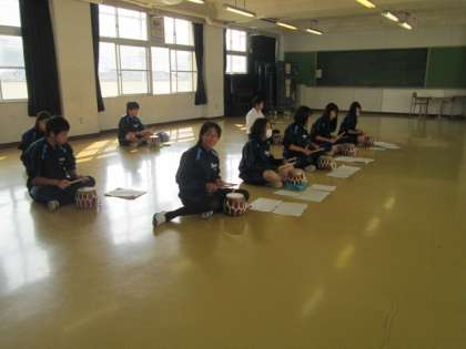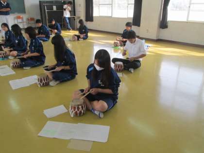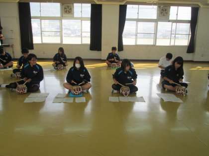 文化祭舞台ステージに出演する2年生が朝から創作太鼓の練習に取り組んでいます。