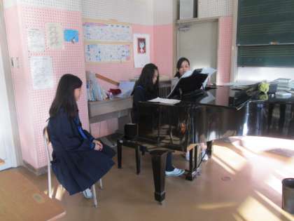 1年生の学年合唱に向けて、女子生徒が朝早くからピアノの練習をしています。その横で友だちが見守っています。