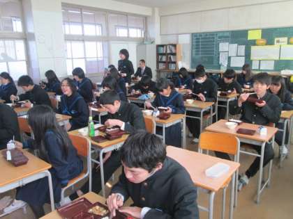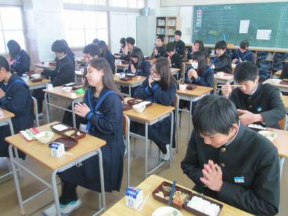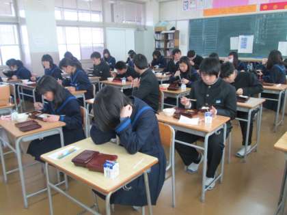 本来は班で給食は食べますが、2年生は受験を考えテスト席で食べています。