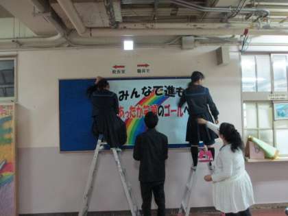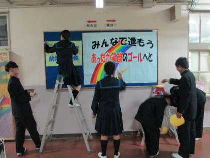 前期生徒会テーマを掲示板に貼っている生徒会役員たちの様子をもう少し紹介します。
