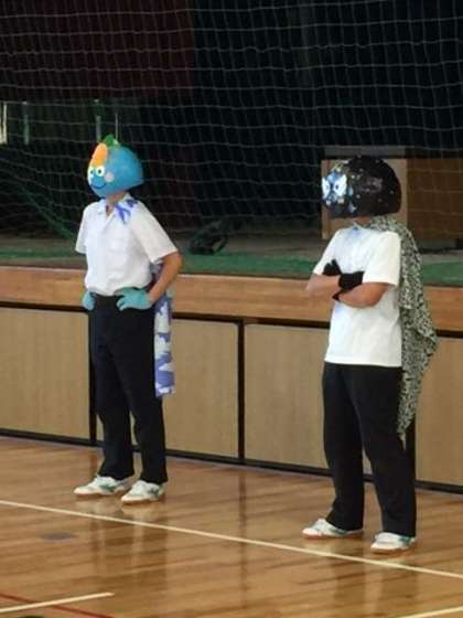 次に、生徒会役員会より、「おはようマン」と「よふかしマン」の紹介がありました。