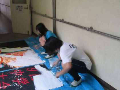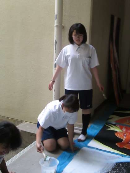 美術部が、体育大会恒例の大看板の制作を始めました。去年の看板を塗りつぶすところから頑張っています。