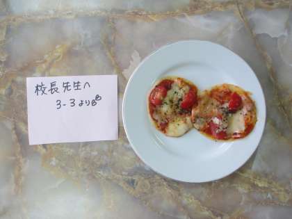 今日は、3年3組が調理実習で作ったピザを届けてくれました。
