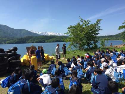 北アルプス連峰をバックに班ごとにイカダ作り。班の団結が問われます。