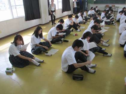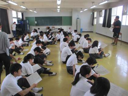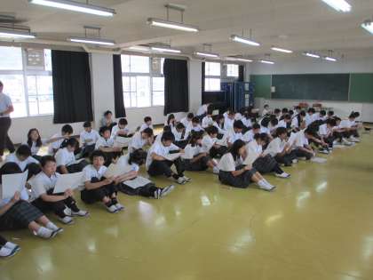 1限目は、集会室で9月に行われる職場体験学習についてのオリエンテーションを行っています。