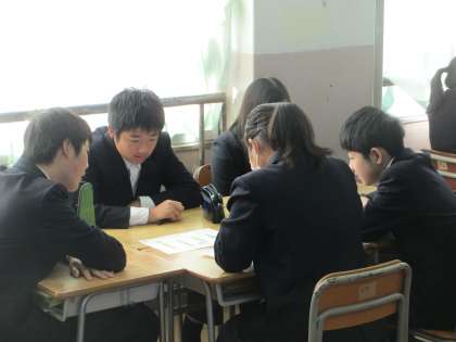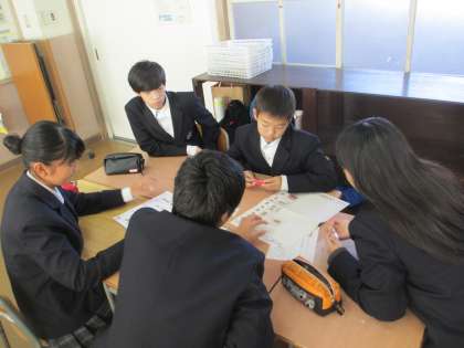 2組の授業では、明日の公開授業につながる内容について、生徒たちが班ごとに考えたり、交流したりしました。