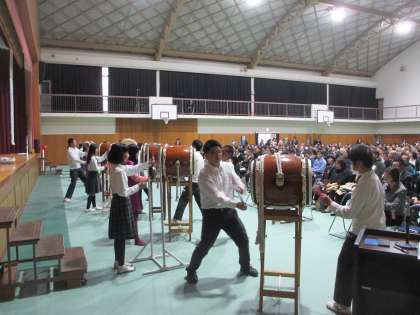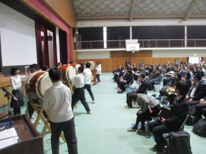 全体会のオープニングでは、本校人権クラブの生徒たちが北条小学校太鼓クラブの6年生とともに「北條太鼓」の演奏を披露してくれました。