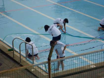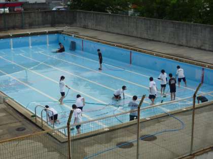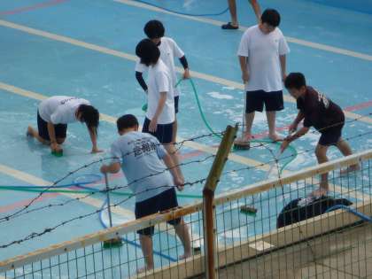 放課後、陸上競技部と女子バスケットボール部の生徒たちがプール清掃を行ってくれています。