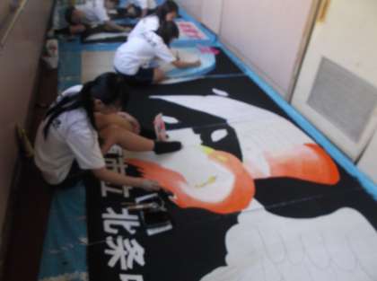 校舎内でも暑い中、美術部が恒例の体育大会看板を作成しています。だいぶ、形になってきました。