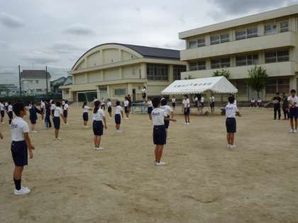 内容は、ラジオ体操ときょうだい学級種目の練習です。生徒会役員からの話の後、ラジオ体操の練習をしました。