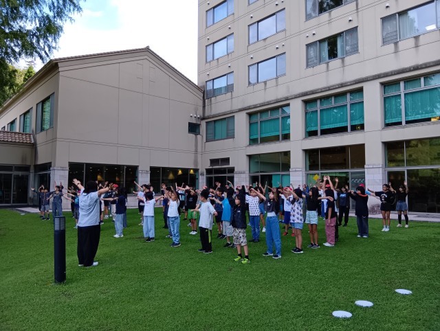 おはようございます。すがすがしい朝です。健康観察のあとで、朝の集いをしました。