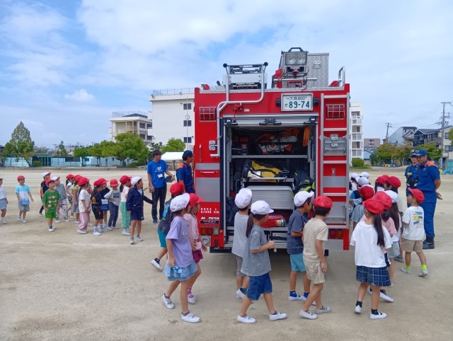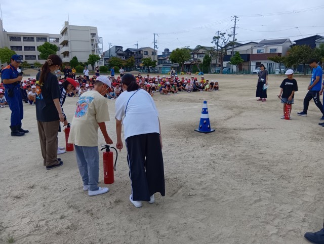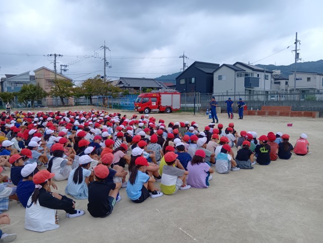 2時間目に消防署の方にお越しいただき、火災避難訓練を実施しました。子どもたちは真剣に訓練に臨み、しっかり話を聞くことができました。「おはしも」の約束に加えて、「て(低学年優先)」のルールを学びました。