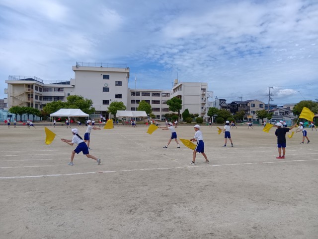 4年生のフラッグが、一斉に風を切ります。心地よい音が運動場に響きます。