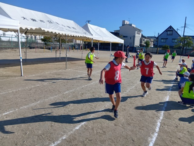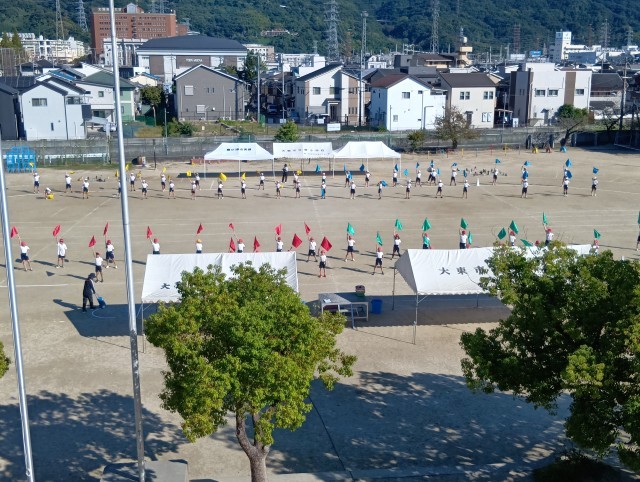 4年生のダンスでは、フラッグが風にたなびいています。全員が揃うと、とても美しいです。半周リレーもしっかり頑張っていました。