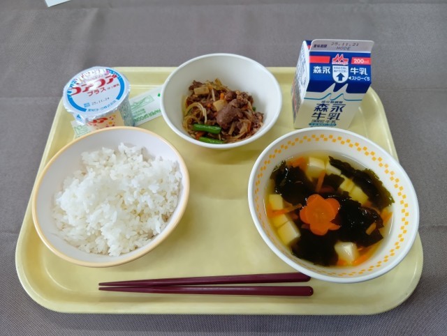 今日の給食は、ごはん、チャプチェ、わかめスープ、ヨーグルト、牛乳です。