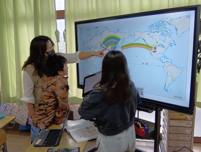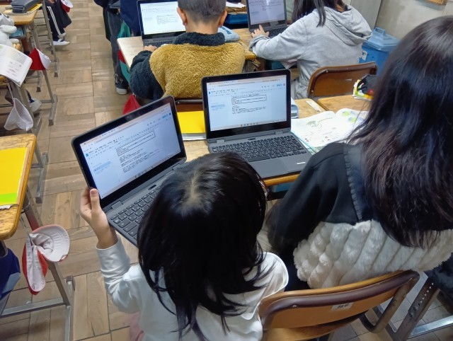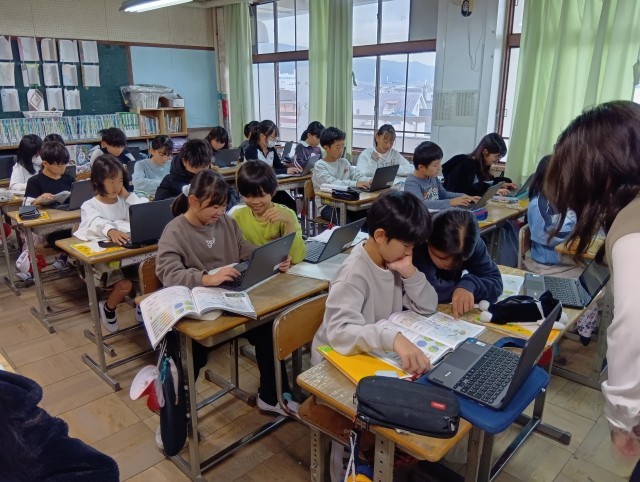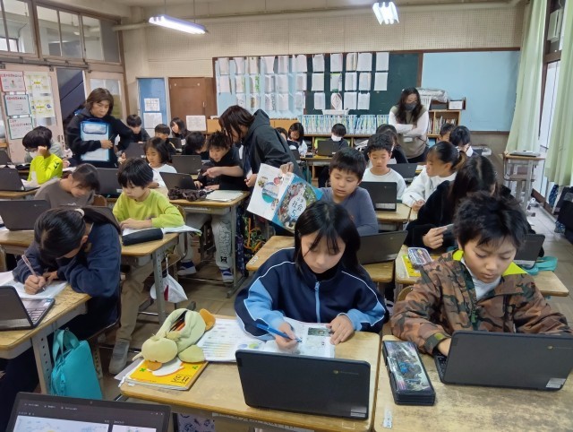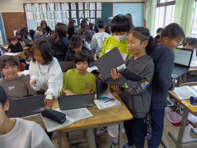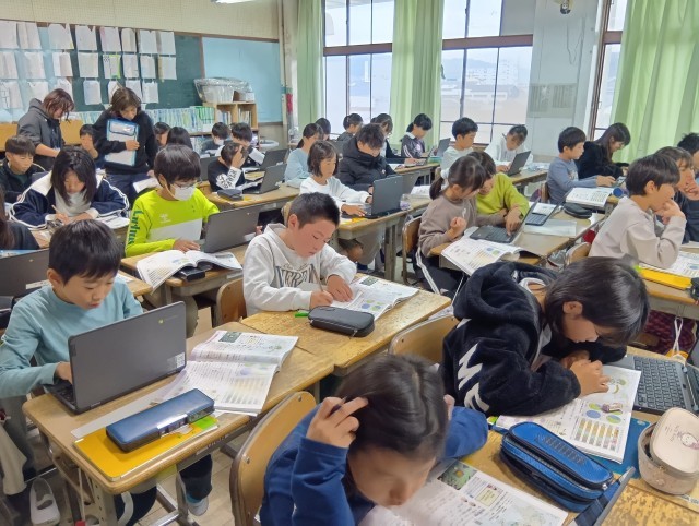 5年生は、社会科「運輸と日本の貿易」の単元で、日本の輸出の特色を学んでいました。まずはクロムブックやノートを使って、教科書本文を読み込んだり、複数の資料をもとに、じっくり個人思考します。考えがまとまったら、自分の考えをよりよくするために友だちと交流していました。45分間頭の汗をしっかりかいて、学び続ける子どもたち。